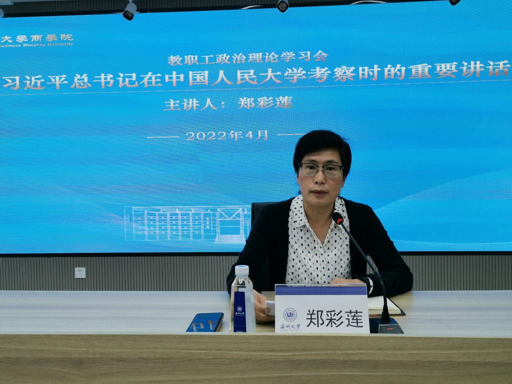 4月27日下午,必赢线路检测中心组织全体教职工政治理论学习会深入学习习近平总书记考察人民大学时的重要讲话精神,公司党委书记郑彩莲领学。