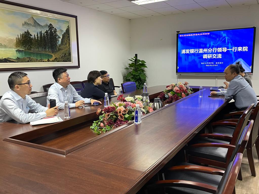 2022年5月10日下午,浦发银行温州分行办公室兼资金财务部经理方珏、温州理工学院经管分院蒲祖生老师等一行来公司调研交流。公司党委副书记唐华、党务秘书聂海燕参加座谈交流,双方围绕金融教育基地申报、活动筹备、联合宣传等问题展开深入讨论。