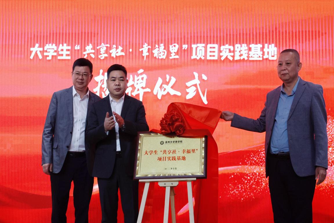 在金融工程系老师及员工的见证下,永嘉县委组织部副部长虞建周、永嘉农商银行董事长徐剑杰与必赢线路检测中心经理胡振华签订三方战略合作协议,并为老员工“共享社·幸福里”项目实践基地进行揭牌仪式。