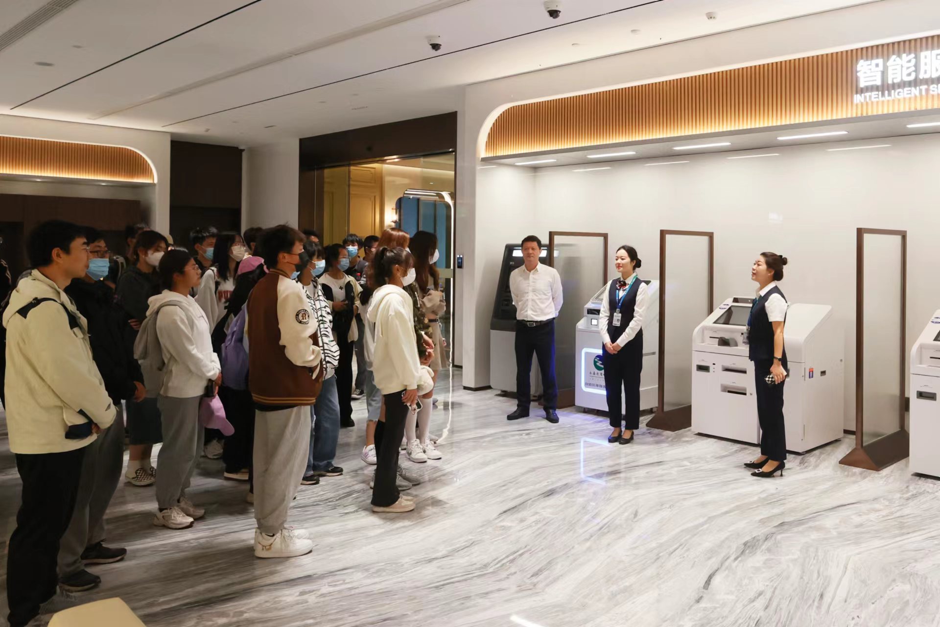 永嘉农商银行总部大楼外部观感高大简洁,上部23层,下部2层的高度设计,恰如其扎实守本心,意欲展宏图的决心。作为一栋综合性大楼,1楼为智能服务与银行业务办理地,专业及其现代化的讲述让员工们体会到银行的业务与创新。