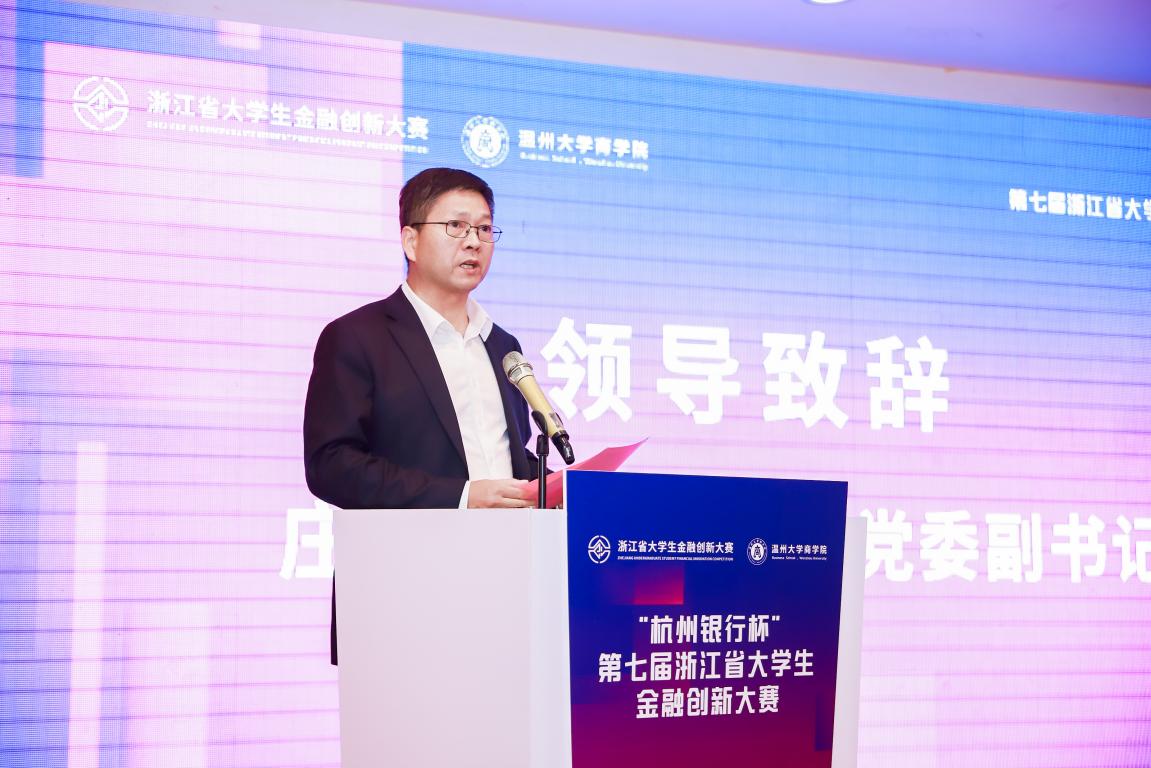 杭州银行股份有限公司科技文创事业部副总经理赵文斌代表本届大赛的冠名单位,对浙江省教育厅、浙江省老员工科技竞赛委员会、钱塘江金融港湾高等教育联盟及各兄弟高校对本届大赛的大力支持表示衷心的感谢。他提出,举办浙江省金融创新大赛是杭州银行和浙江省高等院校战略合作的重要内容之一,也是杭州银行深化校企合作、创新人才培养模式的重要路径之一。浙江省金融创新大赛的成功举办有助于杭州银行与高校在课题研究、员工招聘、学历进修和员工实践等方面进一步深化合作。最后他主张,要继续发扬参赛过程中的创新精神,期待金融赋能,航向未来。