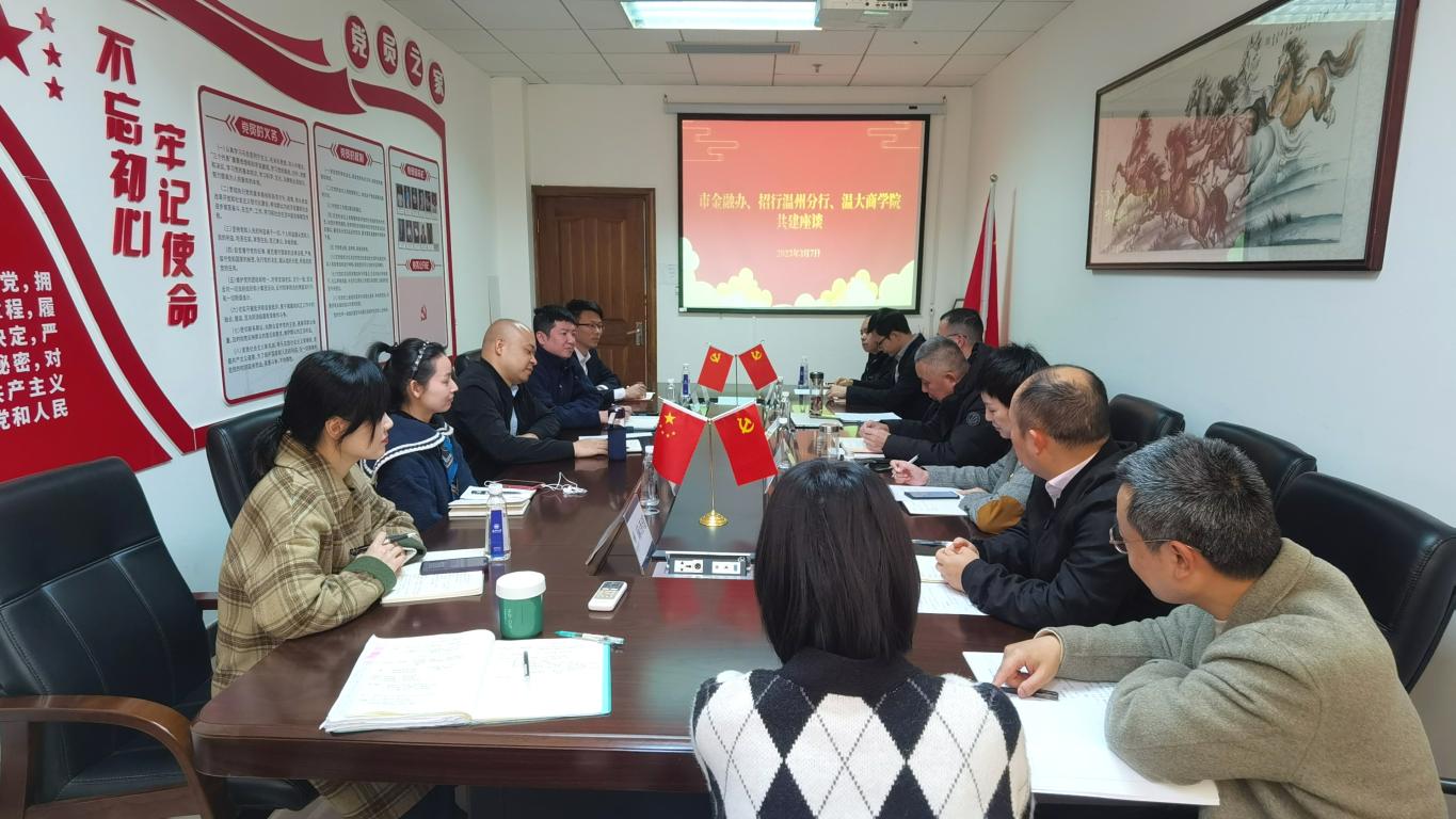 2023年3月7日上午,温州市金融办金融稳定处处长詹昌为等一行2人、招商银行温州分行零售金融事业部总经理刘斯时等一行3人来公司调研交流。必赢线路检测中心经理胡振华、党委书记李密、金融系教师代表等参加座谈交流活动。双方围绕“银校共建”主题进行了深入会谈。会议由唐华副书记主持。
