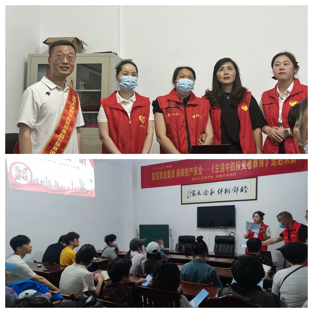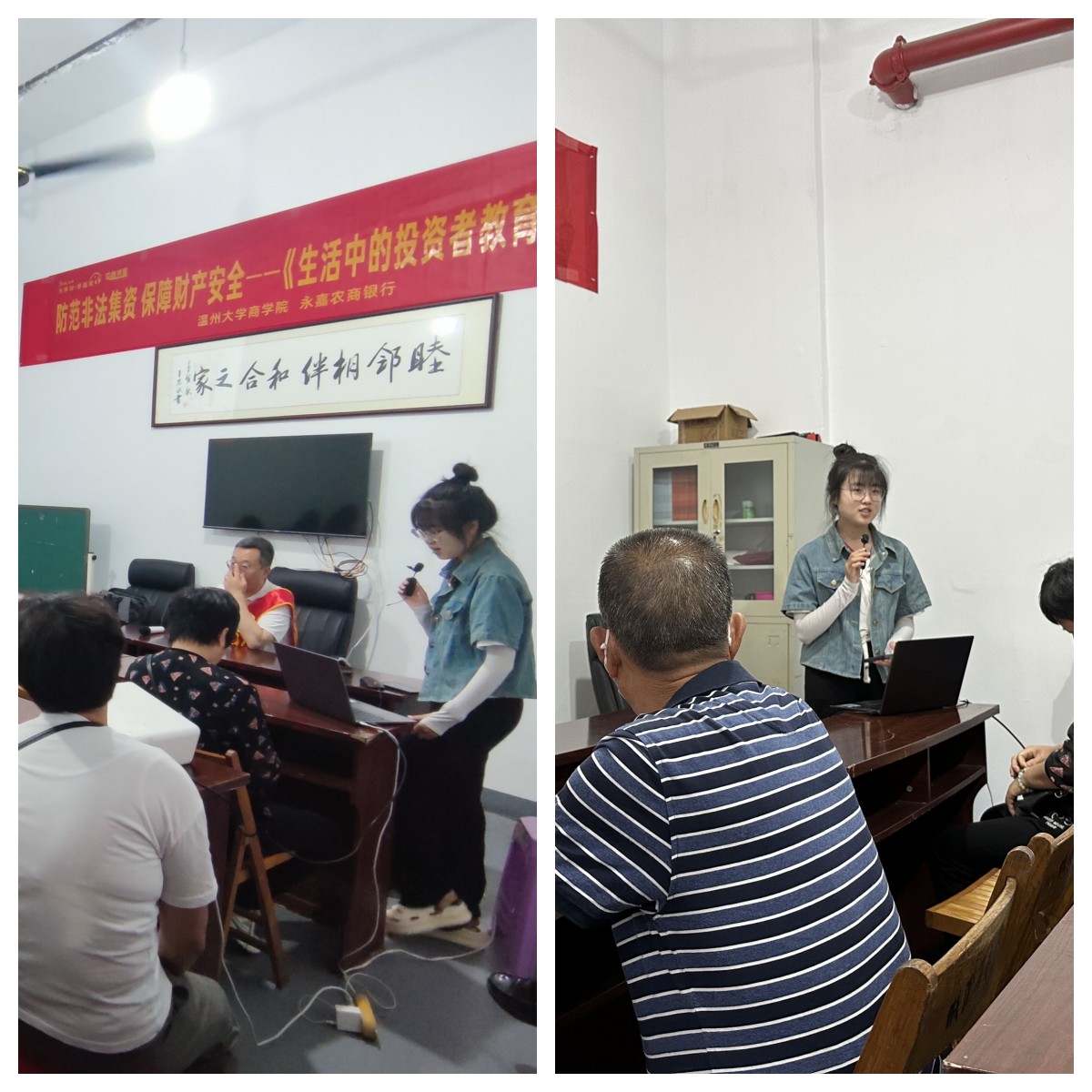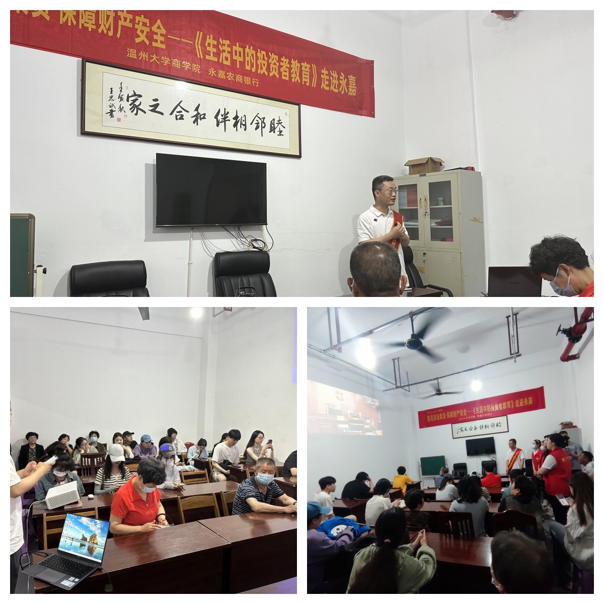首先,《生活中的投资者教育》的老师和员工们到达永嘉县城南锦苑社区,在永嘉农商银行工作人员的带领下来到位于社区内的活动基地。员工和老师积极展开反诈宣传活动的准备工作,等候居民就位。在等候的同时,老师放映了一部根据发生在温州真实案件改编的反诈宣传影片。通过影片,让居民们知道诈骗分子会利用各类五花八门的新鲜手段,去包装粉饰他们的诈骗行为,在利用花言巧语和高收益高回报的宣传,特别容易让老年人或者家庭妇女群体上当受骗。