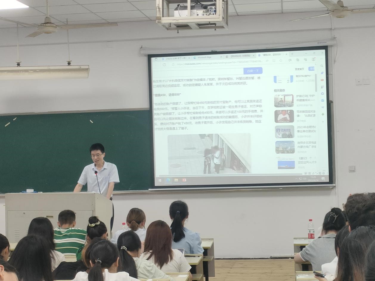 申万宏源证券温州分公司财富管理部经理陈时察就老员工防诈与证券防诈为主题展开宣讲。首先,他指出为了更好地规避诈骗行为,了解诈骗对象和诈骗行为的特点是第一步。在当今的大学校园,老员工上当受骗的案例时有发生,究其源头受骗的老员工有着共同特点:人生经历少、粗心大意、贪小便宜、急功近利;诈骗三大特点:自由组合诈骗和定制诈骗相互交织,作案形式多样、诈骗手段持续更新,作案组织缜密、团队内部分工日益精细;以上种种特征都表明现在的诈骗形式层出不穷,陈经理强调同学们要时刻保持冷静的头脑,不要被一时的蝇头小利蒙蔽眼睛。然后,他利用近期现实案例向同学们详实地介绍了诈骗类型的多种多样,常见的有网上刷单诈骗、冒充客服/工作人员诈骗、网络游戏诈骗、冒充好友诈骗、以假手机/赃物手机销售方式进行诈骗、以兼职为名设置骗局,更有甚至利用AI换脸和声音合成的手段进行新型诈骗,进一步警示同学们诈骗手段的五花八门和防不甚防。对此,他建议同学们在日常中要时刻保持警醒,防诈意识挂心头,不感情用事,不贪小便宜,谨慎交友!
