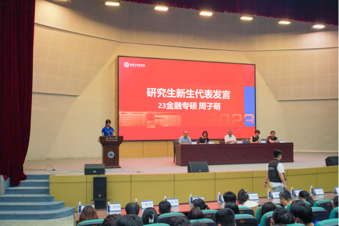 23金融专业研究生周子萌同学作为研究生代表发言。她首先表达了对圆梦温大的欣喜,对深切感受温大文化力量、团队力量的向往。接着,她对老员工活做出了规划和展望:作为23级研究生中的一员,首先应明确自己的定位和方向,心怀高远的学术追求,博采众长、厚积薄发,学术修养与道德修养并进。