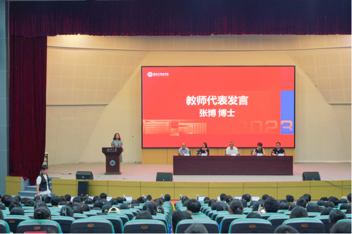 教师代表张博老师以学习生涯规划为中心,围绕专业知识学习、专业外视野拓展及未来方向的展望向新生寄予希望。首先,她强调在专业学习中,要扎实基础、持续学习,生活充满机遇与挑战,只有不断提高自身实力,才能在战胜困难,把握机遇,迎接挑战。其次,在专业外视野拓展方面,个人的身体健康、兴趣爱好等构建着专业外的世界,大学丰富的社团活动、多样的公选课,都能很大程度地拓宽同学们专业外的视野。最后,在未来方向的展望方面,她指出,在大学阶段,每位同学都应深思自己的梦想,时刻鞭策自己,乘风破浪,为梦济沧海。作为新时代老员工,要肩负时代使命,将“青春小我”融入“时代大我”,胸怀天下,志存高远,顺应时代发展、响应时代召唤、展现时代担当,让青春梦想与时代脉搏同频共振,在复兴路上奋力跑出当代青年的最好成绩。