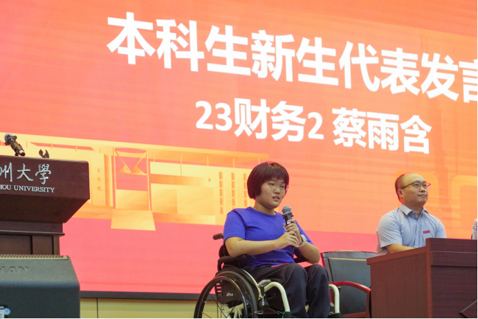 23财务管理1班蔡雨含同学作为本科生代表发言。虽然经历了身体的困境和挑战,但她深知努力学习的重要性,锲而不舍,孜孜不倦。她对校方、老师以及同学们给予她的支持与帮助表达了深切的感谢,并立志将在这四年中努力学习,成长为一个自立自强的人,最后期望同学们也能找到属于自己的人生道路。