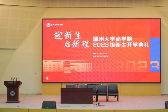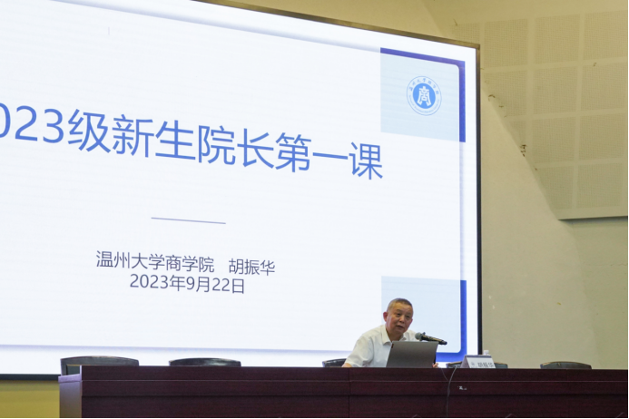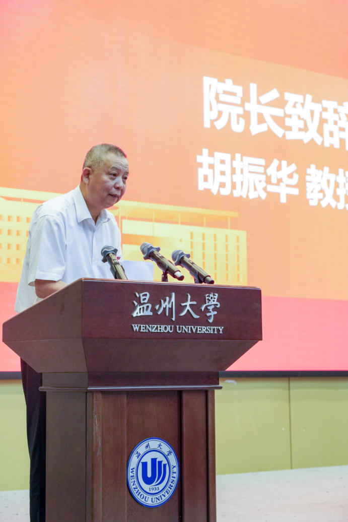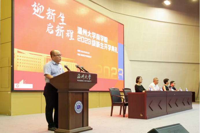 典礼伊始,胡振华经理发表致辞。今年正值温大办学90周年,商院蒸蒸日上,胡经理详细介绍了商院的具体情况,并对新生们提出三点希望。第一点,希望新生们胸怀家国,做有志气的人。爱国是个人立德之源、立功之本,深深扎根于中国人的精神谱系,教导新生们要明确自身责任与发展方向,在时代坐标系中找准自己的定位,追寻人生意义、实现人生价值。第二点,希望新生们笃学善思,做有底气的人。学习,是人类追求幸福生活的必经途径,是人立身的底气。希望新生们尽快适应大学新的学习环境,在黄金般的大学时期,发掘自己学习的潜力和动力,此外,应培养深度阅读的习惯,不断汲取古今中外人类社会数千年的智慧来丰富自身。第三点,希望新生们坚韧不拔,做有勇气的人。成大事者,愈困难,愈坚定信心,愈沉着勇毅。在这追求梦想的漫漫长路上,荆棘遍布,或许会有迷茫与彷徨,但同学们要耐得住寂寞,也要等得起花开,登顶之日,高处俯瞰,这些困难、挫折终将化为你生命的一道道风景。