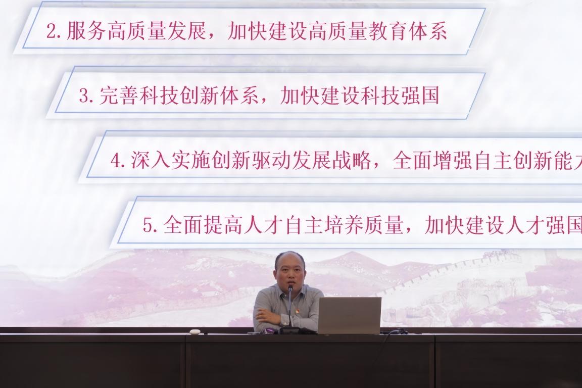 唐华副书记结合实际案例从“着眼长远发展的重大抉择”“铸就强国建设的坚实基础”“加快强国建设的战略部署”“充分发挥高校的重要作用”四个方面展开讲解,强调了教育、科技、人才在实现中华民族伟大复兴中的关键作用,论证了如何有效联动科教兴国战略、人才强国战略、创新驱动战略,实现教育发展、科技创新、人才培养一体推进。