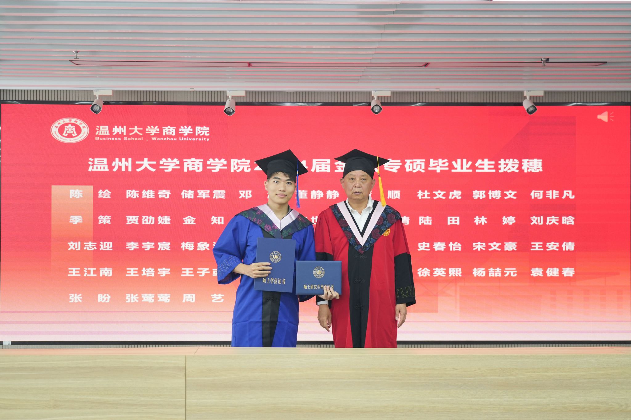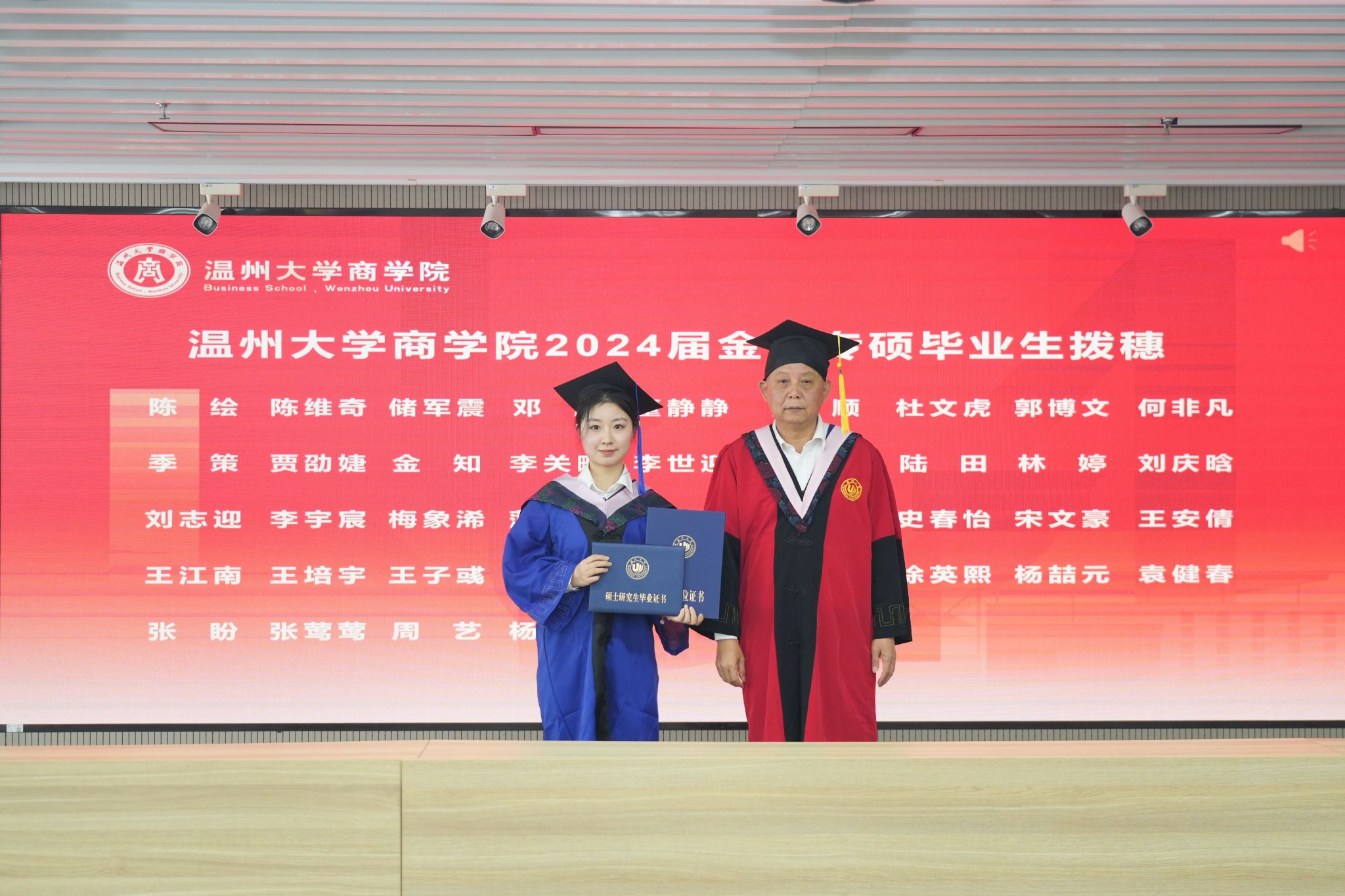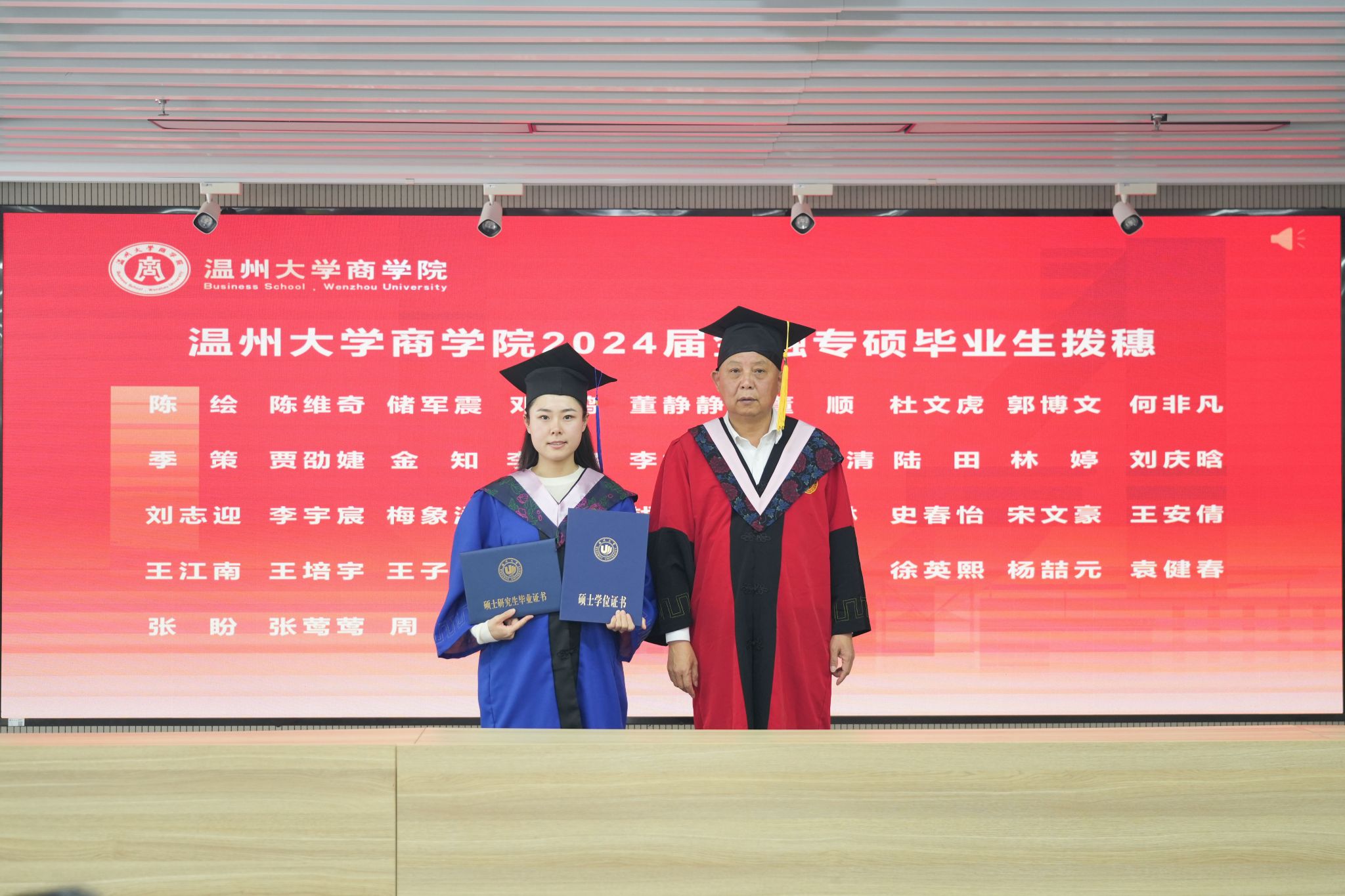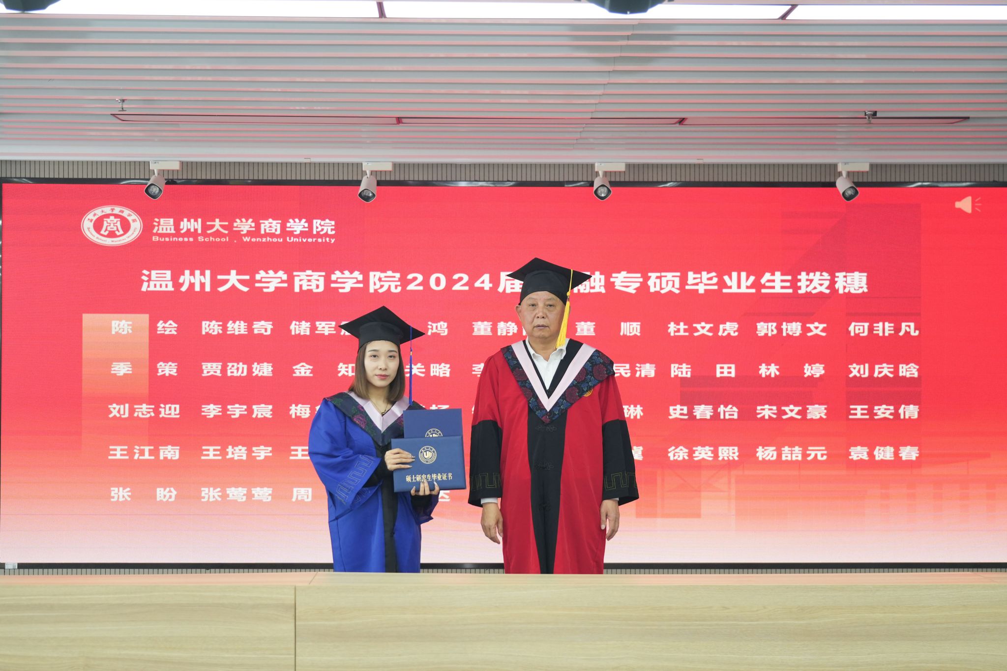 拨穗象征着成熟,代表着毕业生们硕果累累、学有所成。胡振华经理为每一位毕业生颁发毕业证书、学位证书、拨穗,并合影留念。