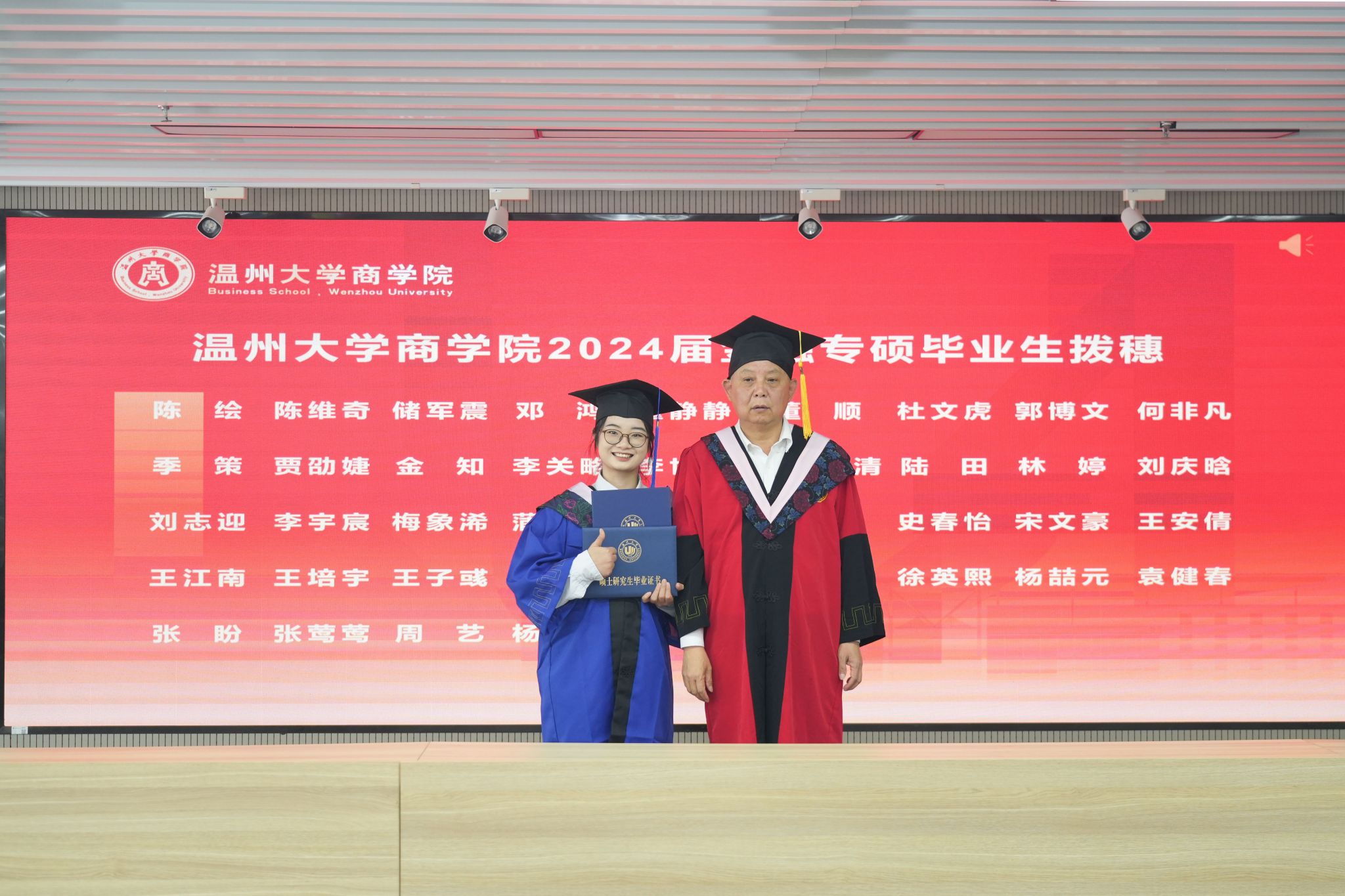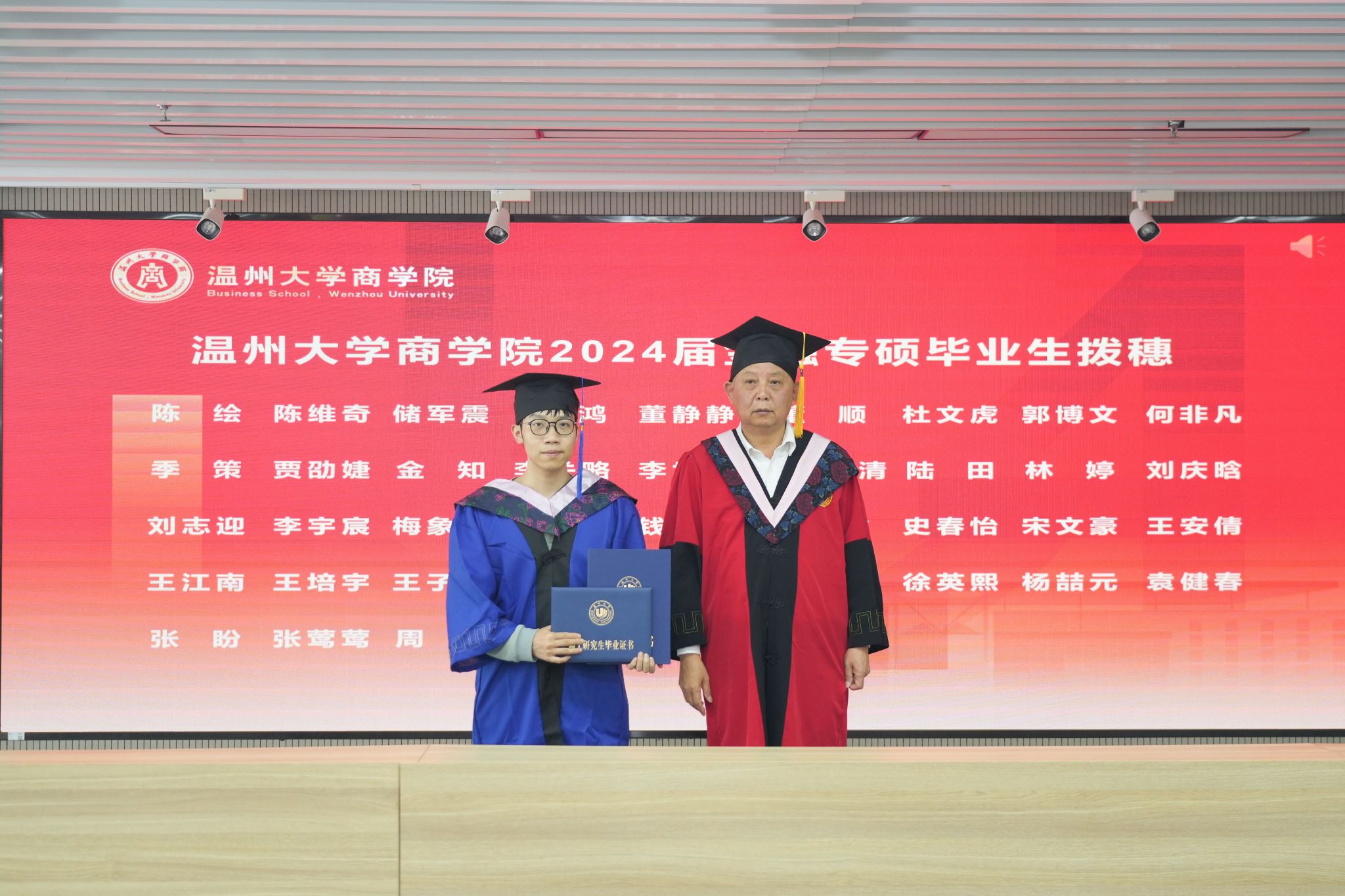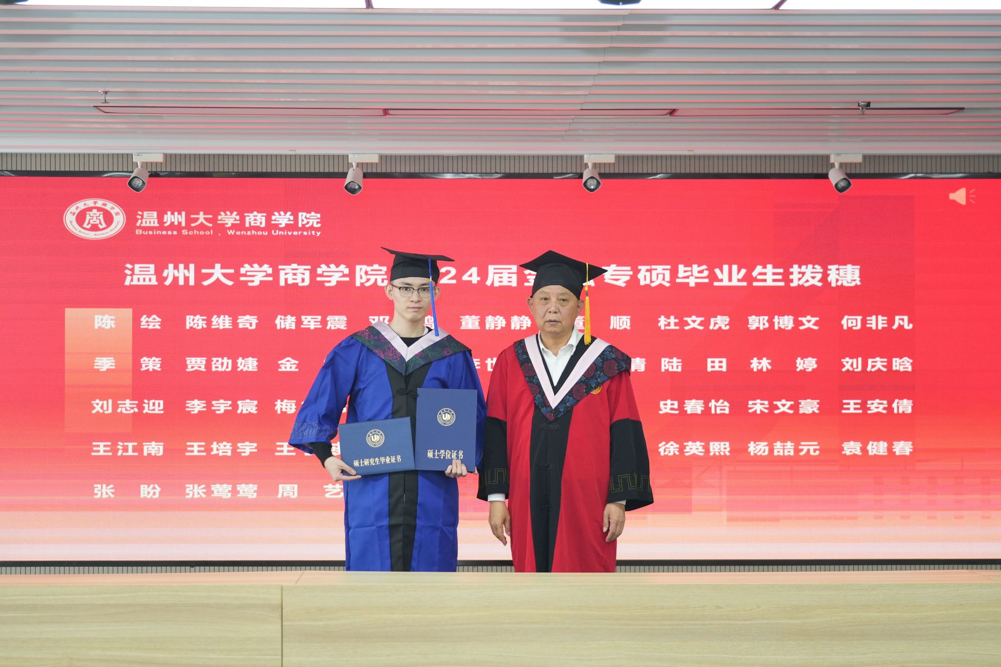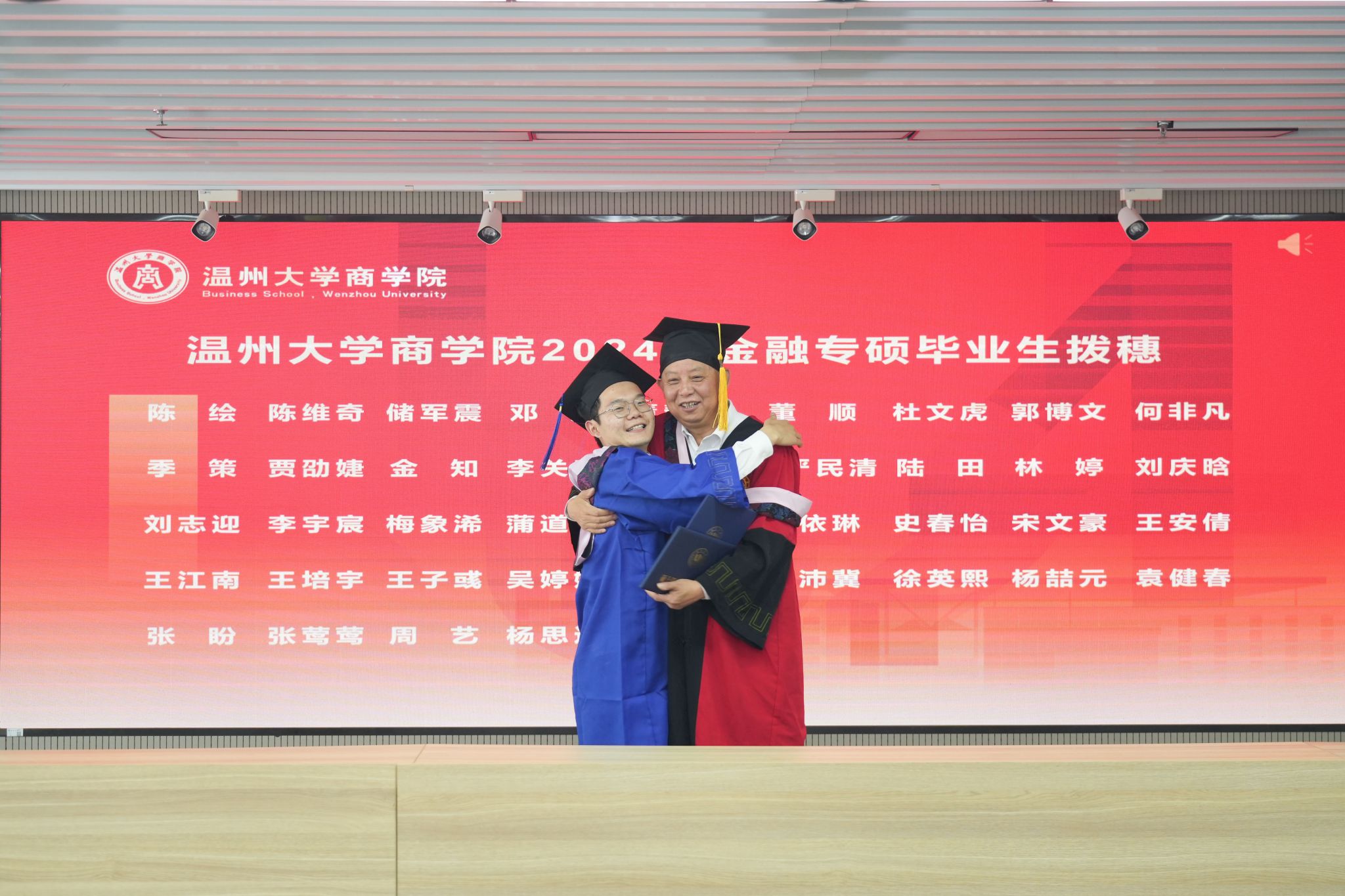 拨穗象征着成熟,代表着毕业生们硕果累累、学有所成。胡振华经理为每一位毕业生颁发毕业证书、学位证书、拨穗,并合影留念。