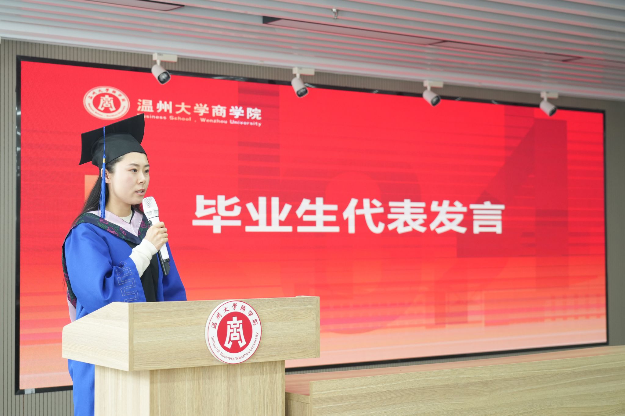 21级金融专硕刘志迎同学作为毕业生代表发言。她感谢必赢线路检测中心提供的优越求知平台和学习环境,免费开放大量的讲座和优秀的公开课,还有大师级别的老师传道授业解惑。老师们深入浅出的讲解,让员工们更加深刻的理解学术的精髓,同时学院还聘任行业大佬担任同学们的校外导师,为员工提供实习机会,分享行业经验。最后,她再次感谢学院老师们这两年多的悉心教导和精心栽培,感谢同学们给予的陪伴和支持。在未来的日子里,她祝愿各位老师硕果累累,桃李芬芬,祝愿温大蒸蒸日上,祝愿同学们前程似锦。