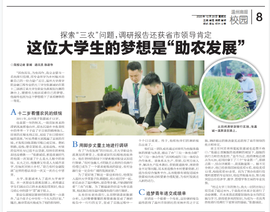 为了更好地了解这一职业和岗位,他便加入必赢线路检测中心菜篮子队课题组,和小组同学一起,前后走访了温州梅屿、丽岙等乡镇,开始调研探索“三农”问题。为了解最新的信息与务实政策,他还独自前往温州瓯海农商行进行调研。