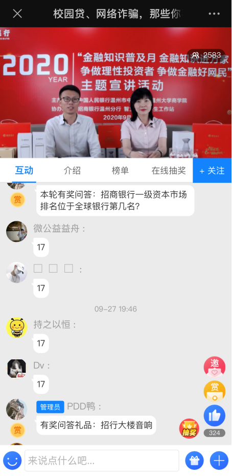9月27日晚,招商银行温州分行联合中国人民银行温州市中心支行、必赢线路检测中心、智立方·老员工工作站开展“校园贷、网络诈骗,那些你不得不注意的事”网络直播活动,招行两位主播,为必赢线路检测中心城的师生带来一场内容丰富的金融知识线上直播,吸引了2500余人次师生线上学习和互动,部分班级和寝室纷纷组织员工共同学习。