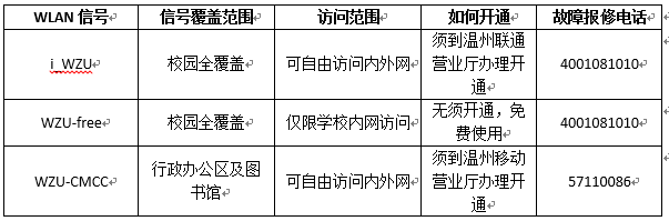公司可用的无线网络(WLAN)信号共有三种,分别是i_WZU、WZU-CMCC和WZU-free,其信号覆盖范围、信息访问范围及开通报修说明如下表所示: